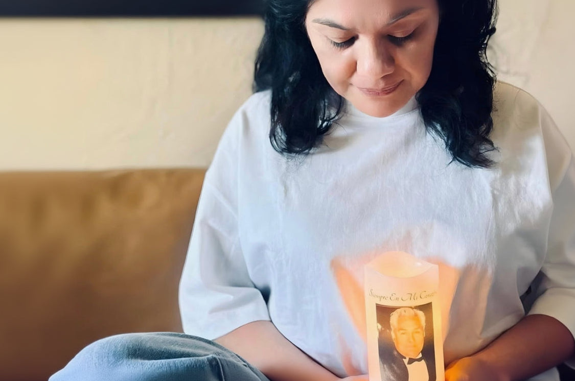 Minimalist Spanish Memorial Candle with Photo, Name & Dates • Personalized LED Remembrance Candle with Quote Options