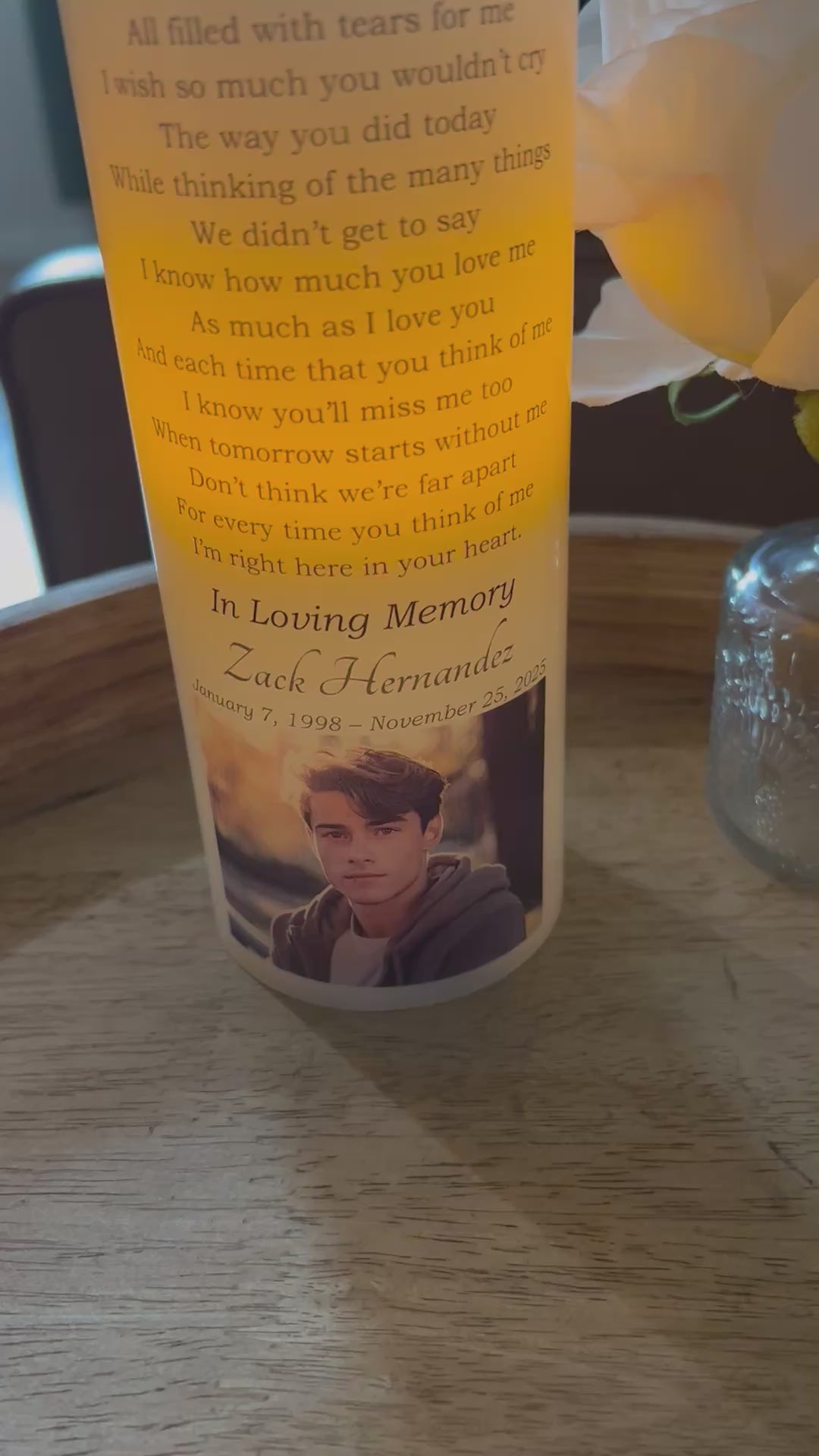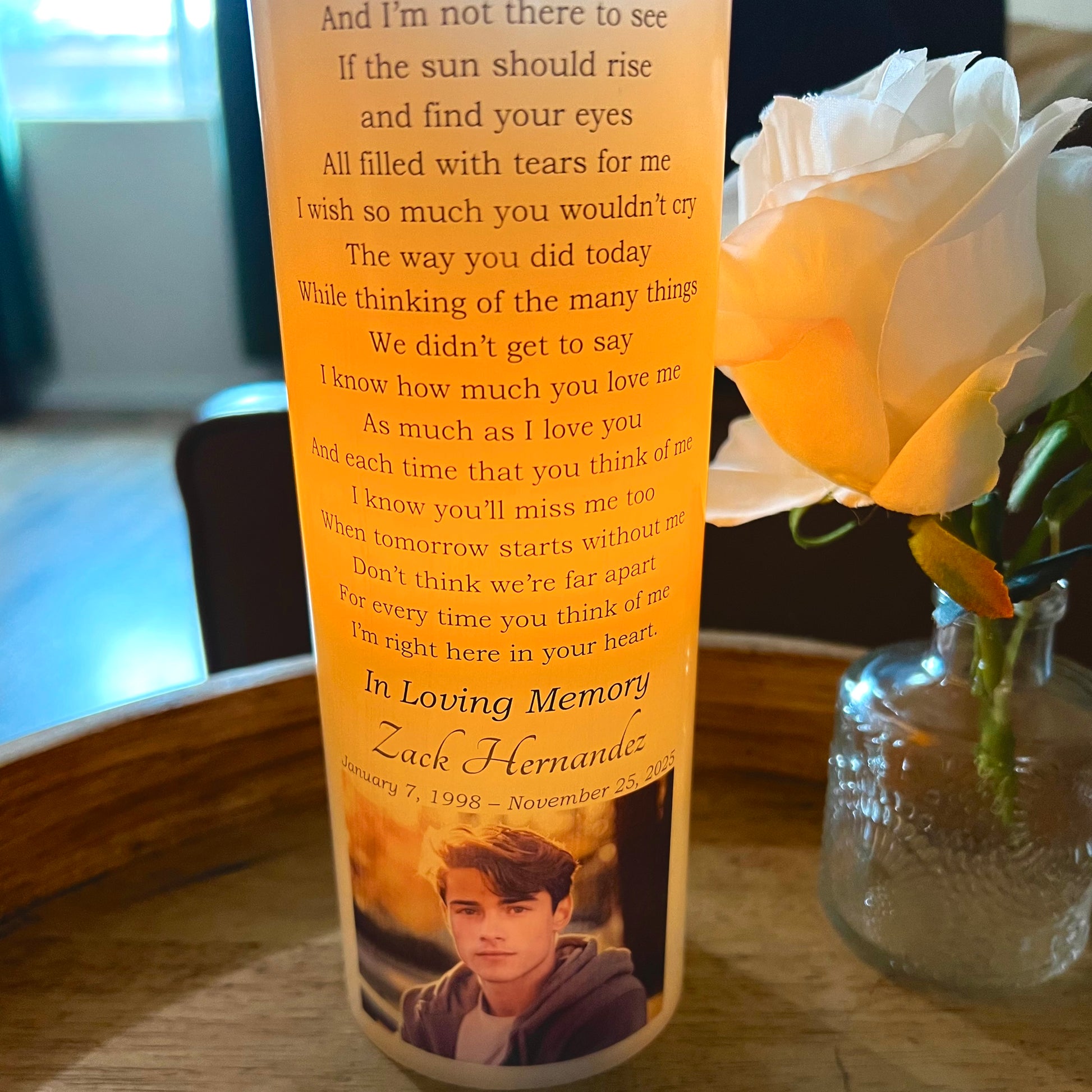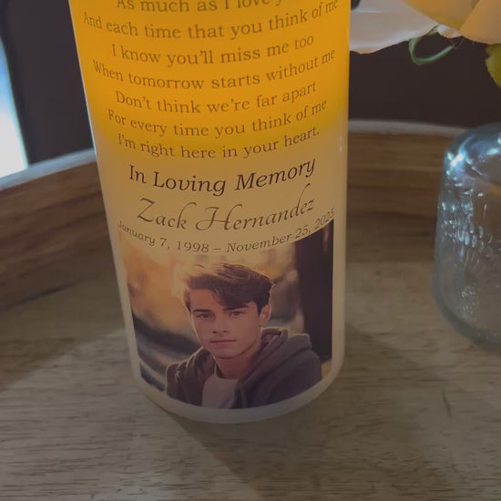 Honor the memory of a loved one with a personalized memorial candle, thoughtfully designed with a photo, name, dates, and meaningful poem. This flameless LED remembrance keepsake offers a gentle glow of comfort for home altars, memorial tables, funerals, and remembrance spaces.