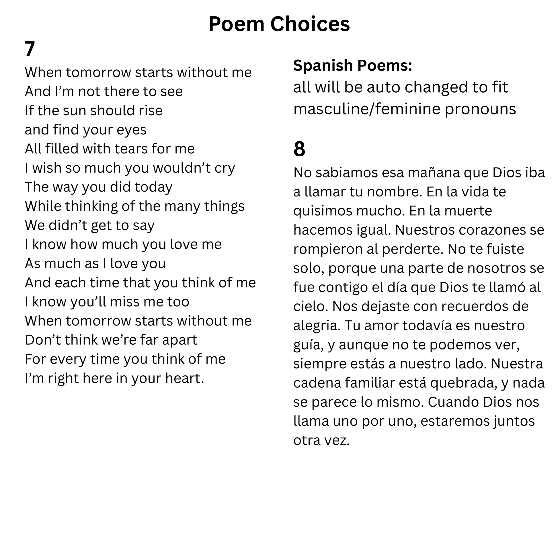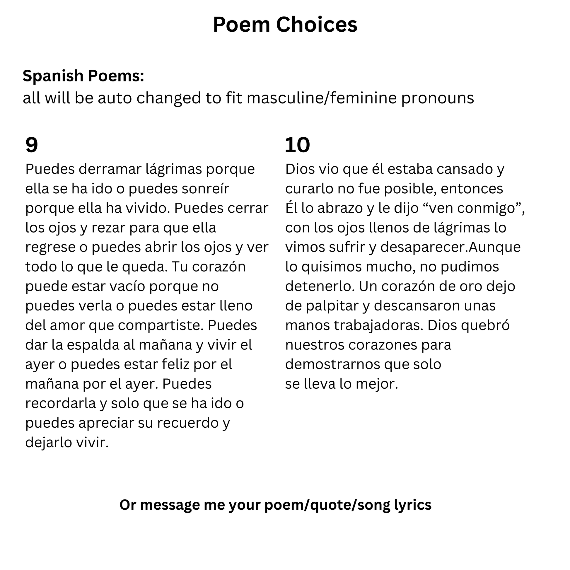 También disponible con poemas en español, creando una vela memorial personalizada que honra con amor la memoria de un ser querido.