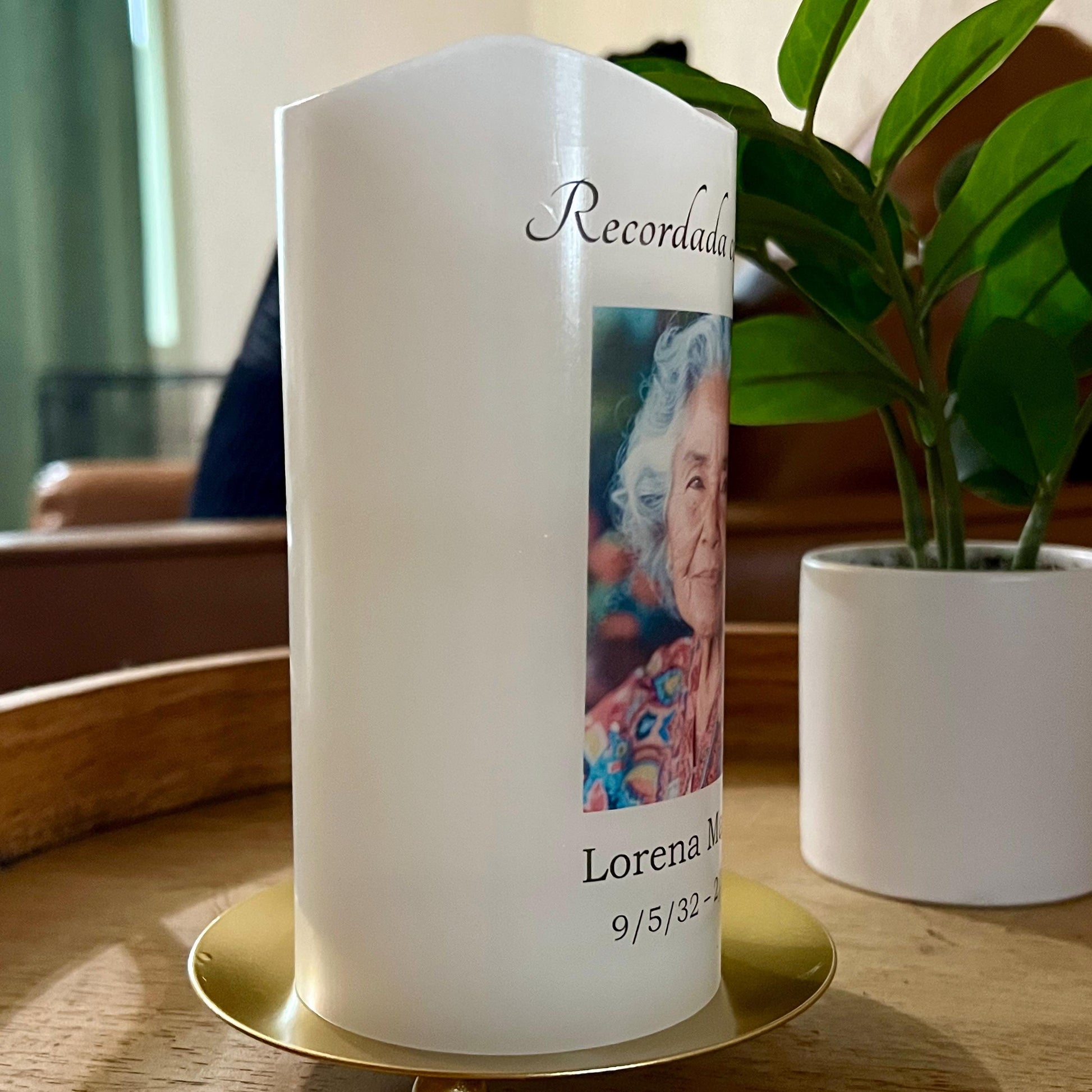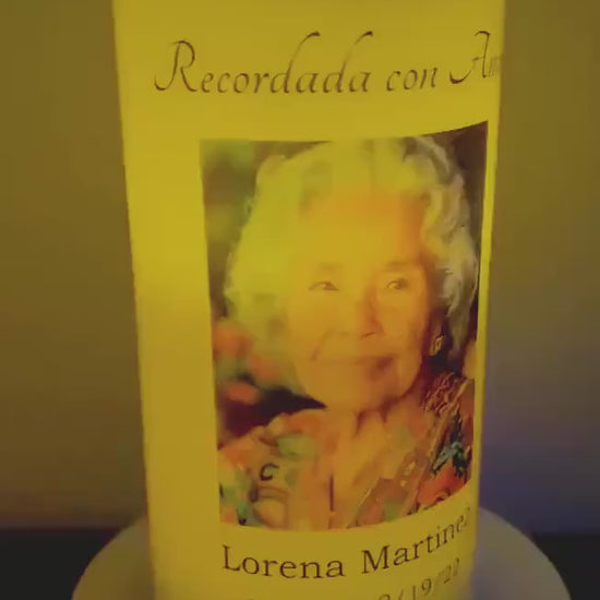 Honre la memoria de un ser querido con una vela memorial minimalista en español, personalizada con una foto especial, nombre, fechas y la frase que más los representa. Su suave luz cálida trae consigo una sensación de paz y consuelo — como si su presencia llenara el espacio con amor eterno. Ideal para altares del hogar, mesas memoriales, funerales y espacios sagrados de recuerdo.