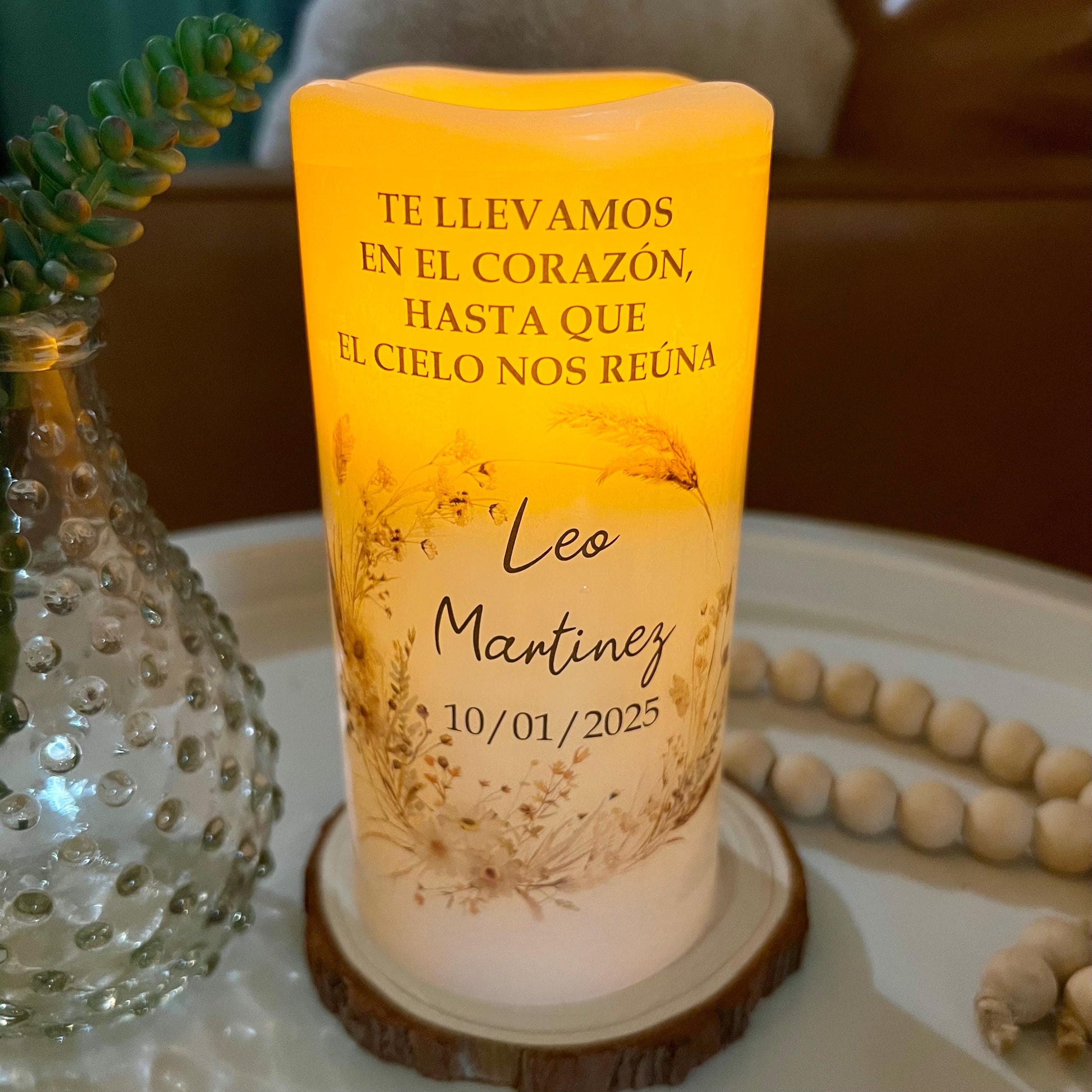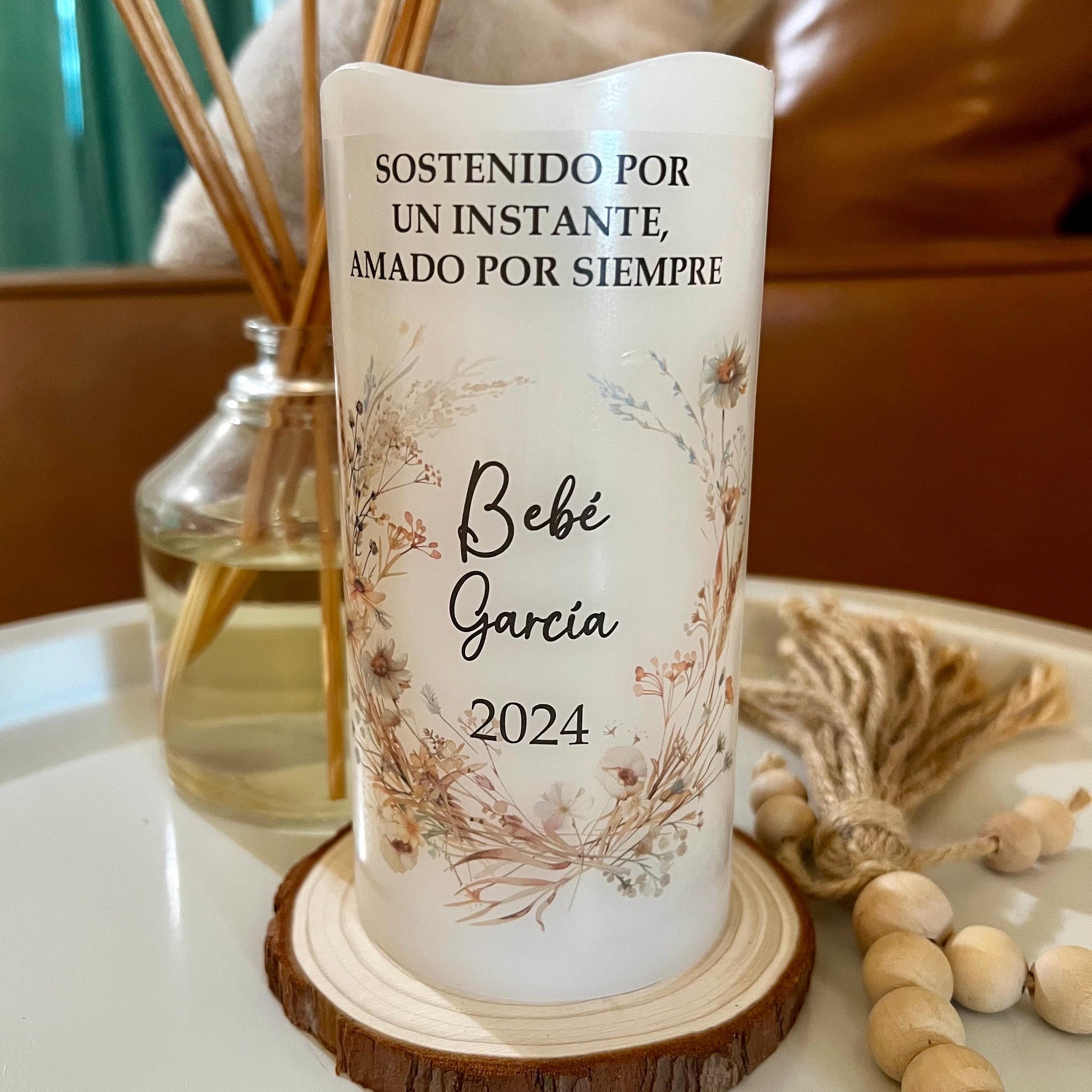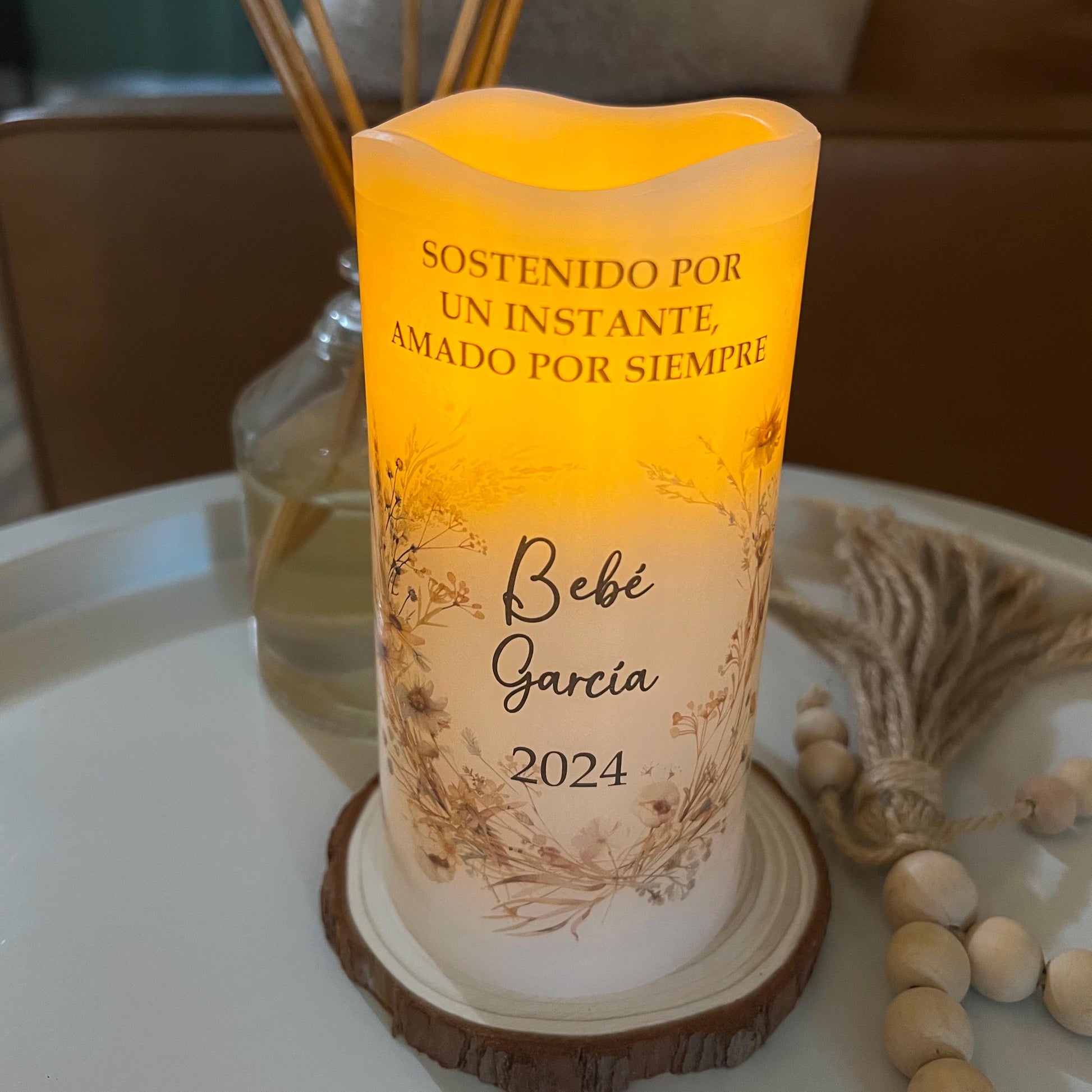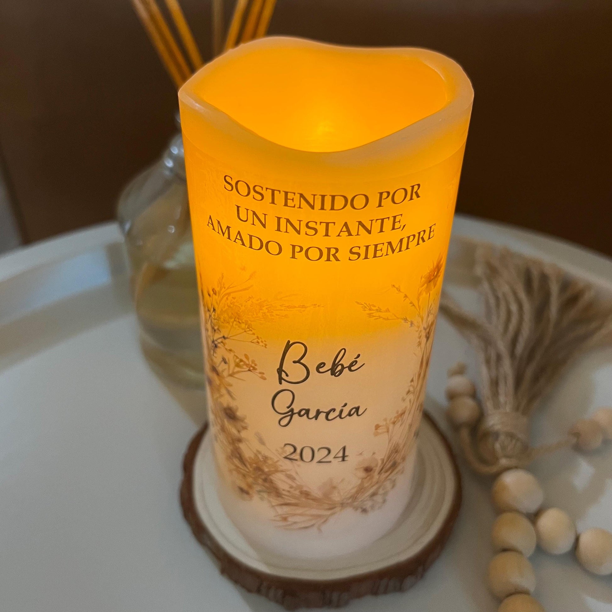 También disponible en español: vela memorial personalizada para bebé, creada para honrar con amor la memoria de un angelito que siempre vivirá en el corazón.