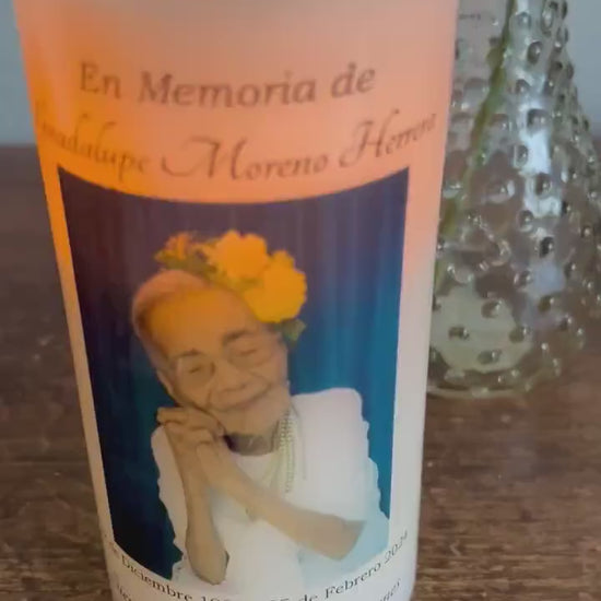 Honre la memoria de un ser querido con una veladora memorial personalizada en español, diseñada con foto en un lado y un poema significativo en el otro. Una luz suave de recuerdo ideal para altares, mesas memoriales y espacios de homenaje.