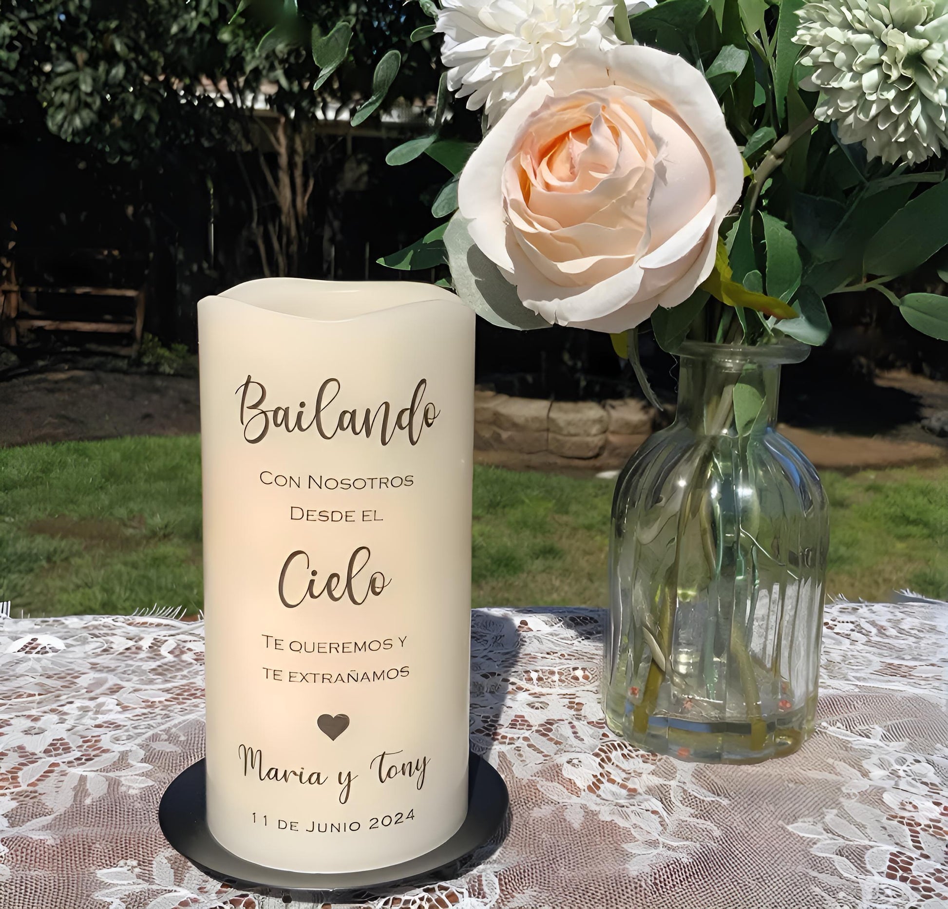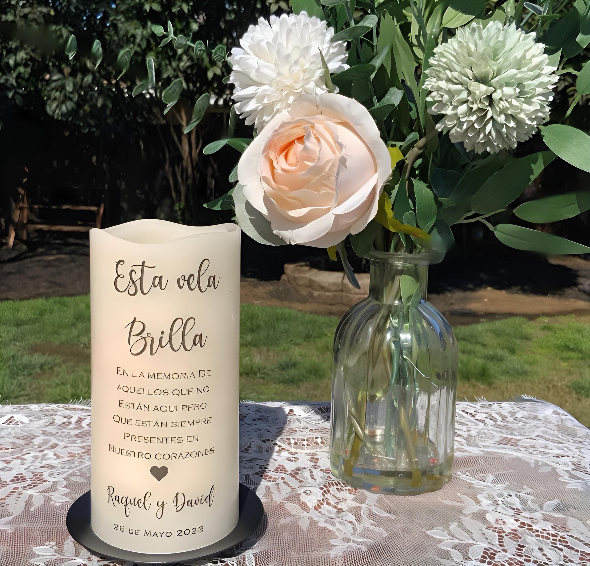 Disponible en inglés o español: vela memorial personalizada para bodas, creada para honrar con amor a los seres queridos que acompañan en espíritu este día tan especial.
