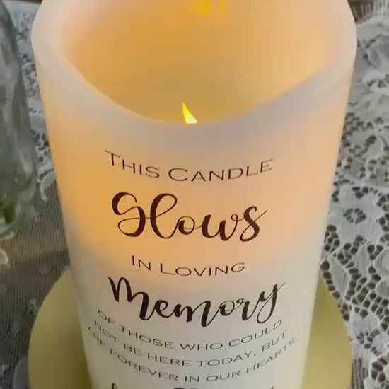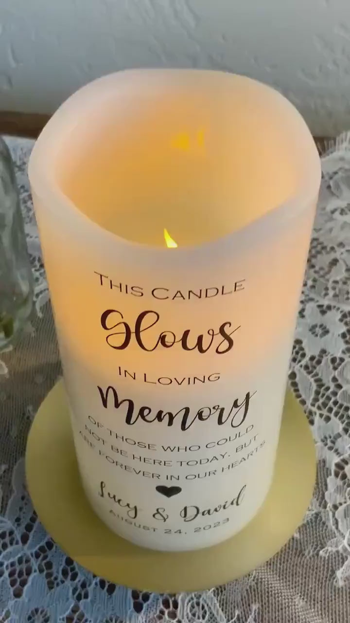 Honor the presence of loved ones who are forever in your hearts with a personalized wedding memorial candle, thoughtfully created for remembrance tables and wedding ceremonies. This flameless LED candle offers a gentle glow of love and remembrance for those who could not be there in person but remain present in spirit.